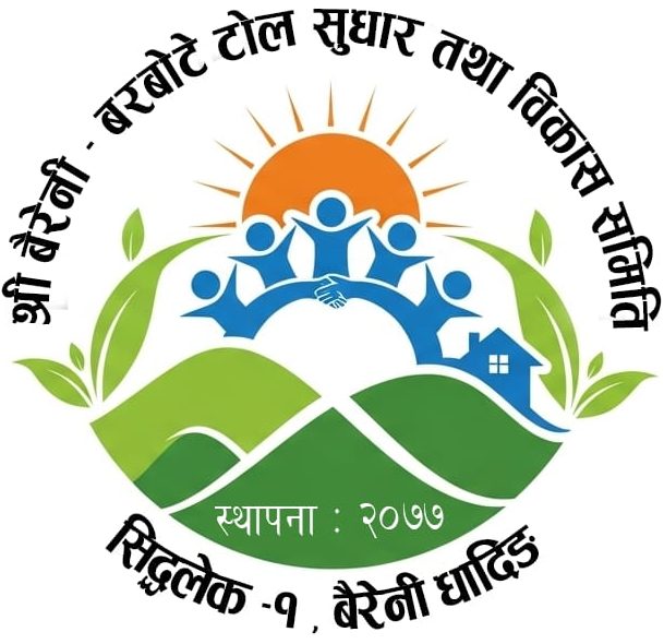 श्री बैरेनी बरबोटे टोल सुधार तथा विकास समिति हाम्रो समुदायको सामाजिक, सांस्कृतिक, र भौतिक विकासका लागि स्थापना गरिएको एक स्वयंसेवी संस्था हो। हाम्रो उद्देश्य स्थानीय स्तरमा सुसंस्कृत, सहयोगी, र समृद्ध समुदाय निर्माण गर्नु हो। हामी विश्वास गर्छौं कि केवल एकजुट र सक्रिय सहभागी समुदायले मात्र दिगो विकास सम्भव पार्न सक्छ। समितिले शिक्षा, स्वास्थ्य, सरसफाइ, वृक्षारोपण, र सामाजिक जागरूकता जस्ता क्षेत्रमा निरन्तर योगदान पुर्याउँदै आएको छ। हामी स्थानीय बासिन्दा, युवा समूह, र महिला समुदायसँग सहकार्य गरी परियोजना र कार्यक्रमहरू सञ्चालन गर्छौं, जसले टोलको जीवनस्तर सुधार गर्ने मात्र नभई सामाजिक एकता र दिगो विकासको आधार तयार पार्दछ।हाम्रो दृष्टि टोललाई सुरक्षित, स्वस्थ, हरियालीपूर्ण र सशक्त समुदायको रूपमा विकसित गर्नु हो। हाम्रो मिशन भनेको प्रत्येक सदस्यको सहभागिता सुनिश्चित गर्दै दीगो विकास, समानता र सहयोगको माध्यमबाट सबैका लागि समृद्धि र अवसर सिर्जना गर्नु हो।