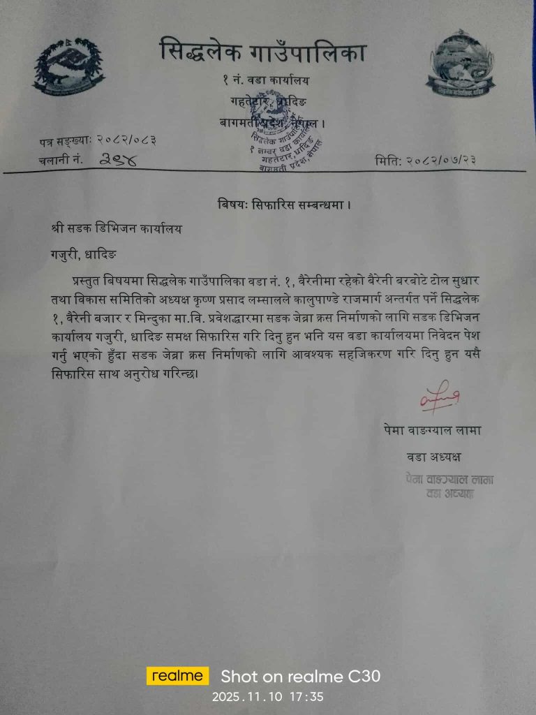सिद्धलेक गाउँपालिका वडा नं. १ ले स्थानीय स्तरमा सडक निर्माणका लागि औपचारिक सिफारिस गरेको छ। बैरेनी बर्वोटे टोल सुधार तथा विकास समितिको पहलमा गरिएको यो सिफारिस गजुरीस्थित सडक डिभिजन कार्यालयलाई पठाइएको हो।